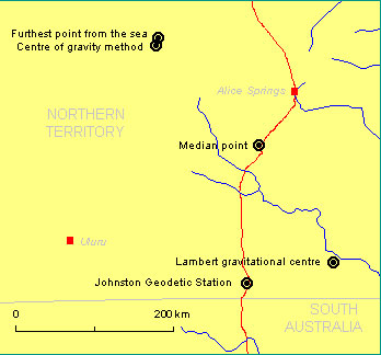 The first method is using gravity. More than 50 000 digitised points representing the coastline of mainland Australia were assigned a unit weight. Using these points the gravity centre of Australia can be located at 23 degrees 7 minutes south latitude, 132 degrees 8 minutes east longitude.