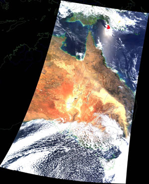 The dust storm is seen as a pale yellow band extending from the Gulf of Carpentaria, down across QLD, towards the coastline and tapering off towards Sydney. The high density section of this band was approximately 1,500 kilometres long, about 400 kilometres wide and about 2,500 metres high.