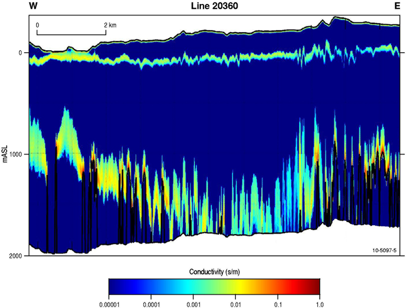 The Versatile Time Domain Electromagnetics (VTEMTM) system operated by Geotech penetrated to depths approaching two kilometres which allows detailed identification of particular features and major structures at depths greater than has been mapped previously using AEM methods.
