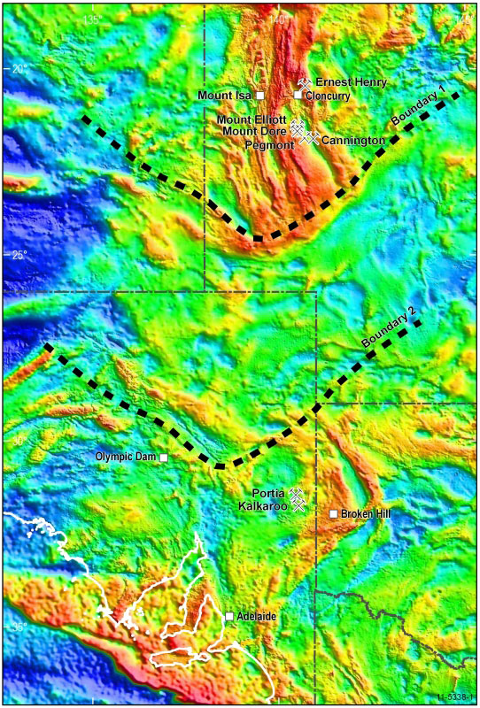 The gravity and aeromagnetic data indicate that a major boundary on the southern margin of the Mount Isa Province and a similar boundary to the north of Broken Hill have been separated through tectonic processes.