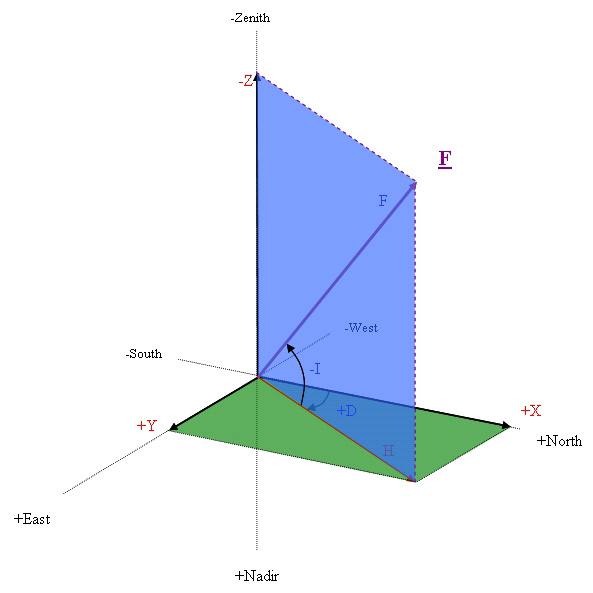 The Earth's magnetic field is a vector quantity, meaning it has both a magnitude (size) and direction. It can be described by combinations of components or ‘elements’. In geomagnetism the elements most commonly referred to are: X, Y, Z, F, H, D and I as shown in the diagram.