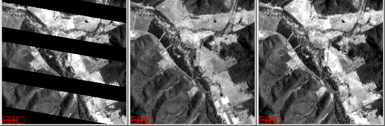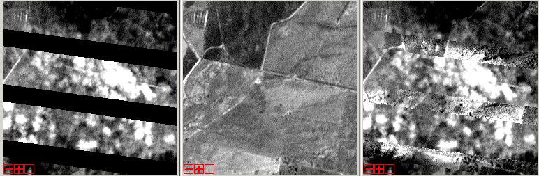 Figure 2 shows another example near the edge portion of a primary SLC-Off scene acquired on 2 March 2004 (left), an SLC-Off fill scene acquired on 18 March 2004 (middle) and the composite product (right) generated from these two scenes.