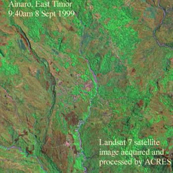 Ainaro lies in the centre of this image, indicated by the purple colours. The ETM Plus Sensor on board the satellite can detect infrared radiation which is released by fires - this shows up as red areas on the image. There is a faintly visible smoke plume evident across the riverbed in the centre of the image.