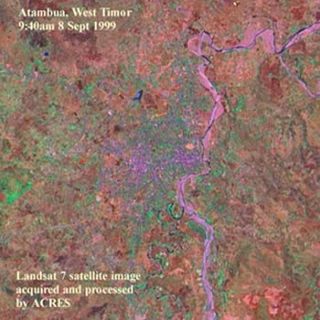 The ETM Plus Sensor on board the satellite can detect infrared radiation which is generated by any form of heat. These 'hot spots' appear in red. They can be caused by elements such as fire, tin roofs, concrete slabs and cars.