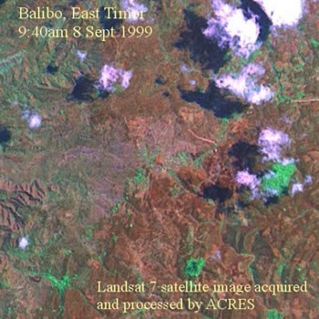 The ETM Plus Sensor on board the satellite can detect infrared radiation which is generated by any form of heat. These 'hot spots' show up as red areas on the image. They can be caused by elements such as fire, tin roofs, concrete slabs and cars.
