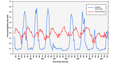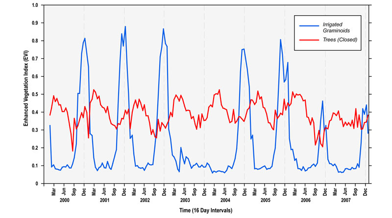 Remote sensing data recorded over a period of time allows the observation of land cover dynamics. Classifying these responses provides a robust and repeatable way of characterising land cover types. A key aspect of land cover is vegetation greenness. The greenness of vegetation is directly related to the amount of photosynthesis occurring, and can be measured with an index such as the Enhanced Vegetation Index (EVI) hence different vegetated land cover types can be distinguished.