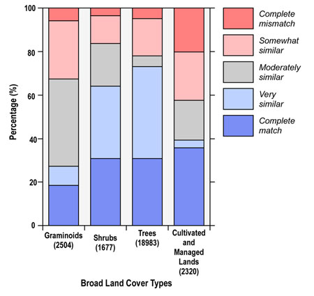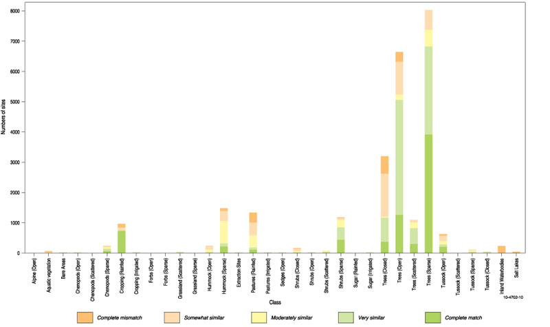 The match between the field data and the Dataset was exact in 30 per cent of cases, very similar in 35 per cent of cases, moderately similar in 10 per cent of cases, somewhat similar in 18 per cent of cases and a complete mismatch in 7 per cent of cases. These results show a high degree of consistency between the Land Cover Map and extensive independent field-based datasets. The accuracy of the land cover map across the main land cover types is shown Figure 2 and and the accuracy of the land cover map across all 34 ISO classes is shown Figure 3.