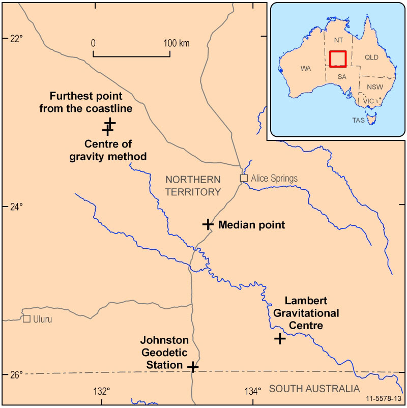 Over time and with ingenuity, several other methods for calculating the possible centre of mainland Australia have been developed. Covered in more detail below, the results enclose an area which includes the town of Alice Springs and the MacDonnell Ranges, two icons of central Australia.