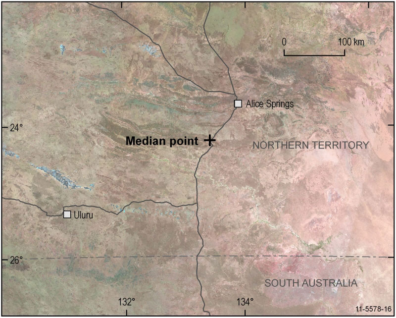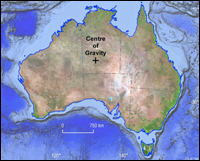 More than 50,000 digitised points representing the coastline of mainland Australia were assigned a unit weight. The moments were calculated assuming equal units of latitude and longitude, the latter varying with the cosine of latitude. So what does all this mean? Imagine you had a perfect cut-out of Australia, with thousands of tiny weights distributed along the perimeter. The centre would be the place where you could balance the cut-out on a pin, and it would be perfectly horizontal. The results for this method would be: