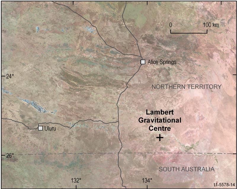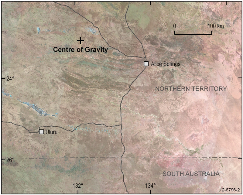 In the 1930s when Dr C.T. Madigan travelled through Central Australia he calculated the centre of gravity by using a metal cut-out of Australia with a plumb bob and string. His crude measurement was surprisingly accurate as he selected a point less than 11 kilometres due west of this present position.