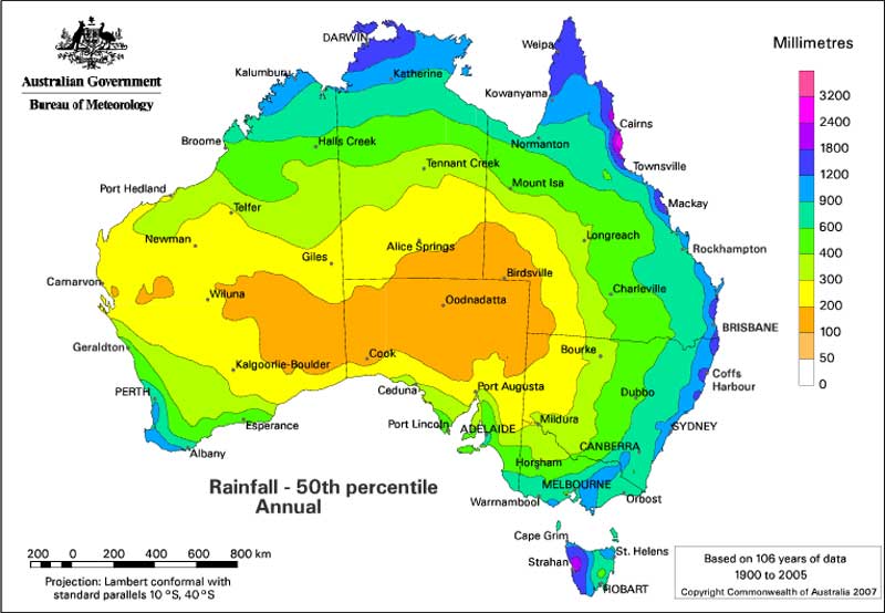 Rainfall in Australia is highly variable with low average annual rainfall over most of the continent and intense seasonal falls in the tropics.
