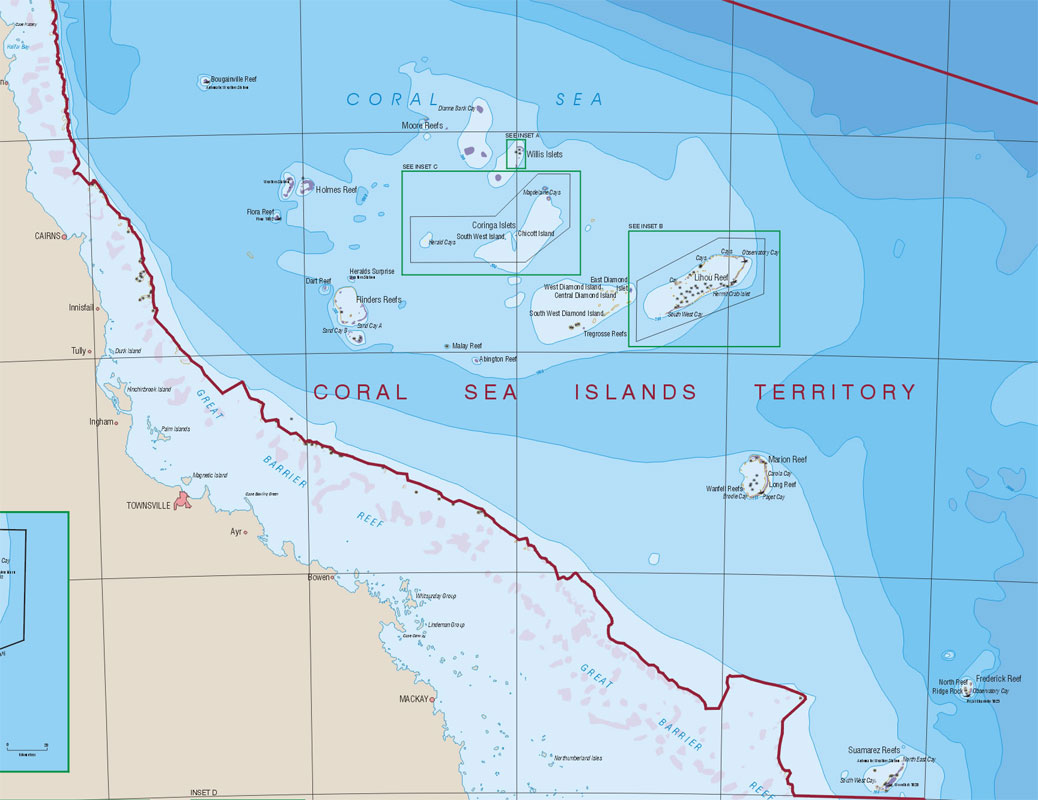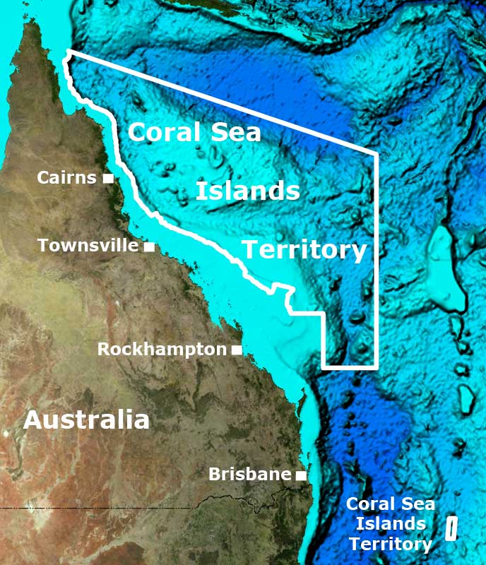 The Coral Sea Islands Territory is made up of many small islands spread over an extensive geographic area extending east and south from the outer edge of the Great Barrier Reef and including Heralds Beacon Island, Osprey Reef, the Willis Group and 15 other reef/island groups. However, the coral and sand islands are quite small and the total area of all the islands making up Australia's Coral Sea Islands Territory is only seven square kilometres.