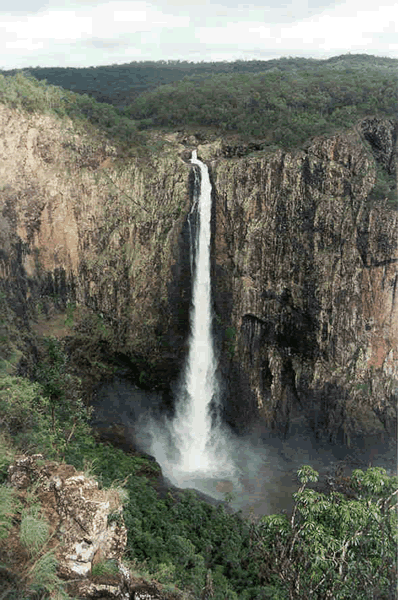 Towards the east, the flat land rises to the Great Divide which runs parallel to the east coast from the tip of the Cape York Peninsula in Queensland almost 4000km south to the Grampians in Victoria. This separates rivers flowing to the west and north from those flowing to the Pacific. The Eastern Highlands are made up of a series of mountains in the south topped by Mount Kosciuszko and volcanic plugs, ash domes and flow remnants further north. These are evident in areas such as the Mount Warning Shield Volcano formed about 23 million years ago on the New South Wales-Queensland border, the Glass House Mountains further north and Mount Surprise in North Queensland. These formations were created as Australia moved over a volcanic hotspot. Some southern plateaus are dissected by erosion into rugged hills with the eastern edge forming the high escarpments. Some of Australia's most spectacular waterfalls occur where rivers flow over the Great Escarpment.