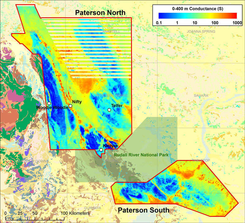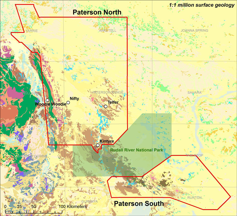 The Paterson project area is centred on the Kintyre uranium deposit and provides AEM data coverage over those areas where Paleoproterozoic Era Rudall Complex and Neoproterozoic Era sediments of the Yeneena Basin either outcrop or are expected to lie beneath less than 500 metres of cover. The area also includes the Telfer gold deposit, the Nifty copper deposit, the Woodie Woodie manganese deposit and others.