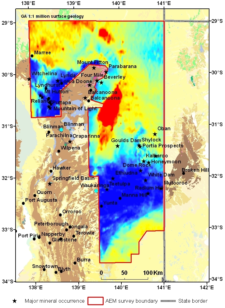 The Frome Embayment-Murray Basin project will provide regional AEM data over a 95 000 square kilometre area between the Flinders Ranges and the State border in South Australia. Extensive Mesozoic to Cenozoic cover blankets the highly prospective area, which hosts major palaeochannel-type uranium deposits at Beverley, Four Mile, Honeymoon and Goulds Dam.