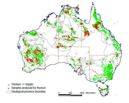 A general understanding of the crustal distribution of thorium in Australia was gained from Geoscience Australia's OZCHEM dataset which has information on 56 000 rock, regolith and drill hole samples which have been analysed for thorium. Figure 1 shows the distribution of the 56 000 sample sites and where samples returned an analytical result of 50ppm or greater thorium content.