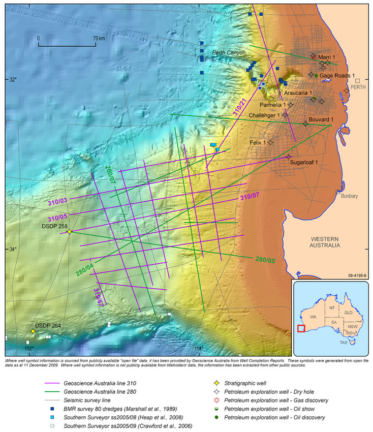 Initial geological assessment of the Mentelle Basin (Bradshaw et al., 2003, A revised structural framework for frontier basins on the southern and southwestern Australian continental margin) suggested the presence of thick sedimentary successions that were interpreted to be of similar age to those in the adjacent southern Perth Basin. The basin therefore was identified as an area potentially prospective for hydrocarbons.