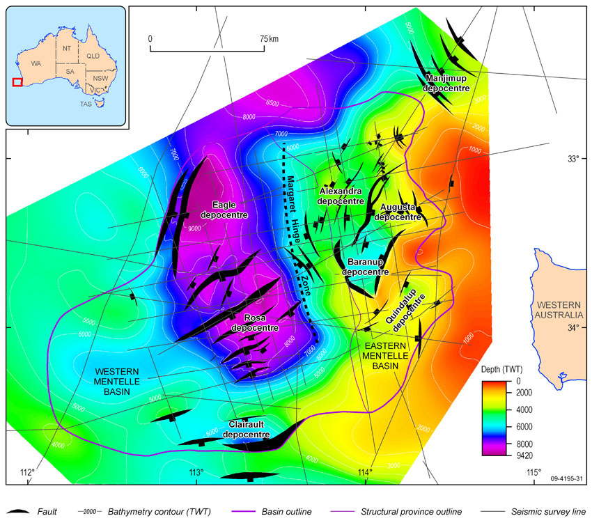 The western and eastern Mentelle basins are separated by the Margaret Hinge Zone and have distinctly different fault and depocentre geometries (Figure 3). Major faults in the eastern Mentelle Basin strike predominantly north-northwest to north-northeast. Several mapped depocentres containing up to 7 to 9 kilometres of sediments have been interpreted as remnants of Permo-Trassic half-graben, which were mostly eroded at the onset of the Mid-Jurassic rifting.