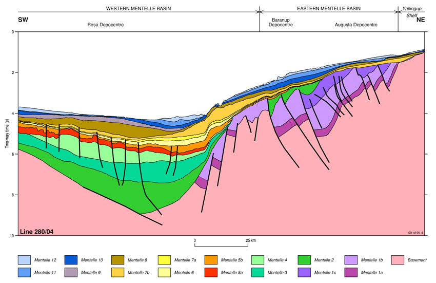 Results of the study have shown that initial rifting in the Mentelle Basin occurred in the Early Permian, followed by thermal subsidence during the Triassic to Early Jurassic. Permo-Triassic successions up to 7 kilometres thick are interpreted in the eastern Mentelle Basin. In the Middle Jurassic to Early Cretaceous during the breakup of eastern Gondwana, major extension and syn-rift deposition occurred in the western Mentelle Basin, which was located near a triple junction between Australia, Antarctica and India. During this time very thick (7 to 9 kilometres) sedimentary successions accumulated in half-graben depocentres. Continental breakup on the south-western margin in the Early Cretaceous was accompanied by extensive volcanism. Up to 1 kilometre thick syn-breakup volcanic succession comprising lava flows and volcaniclastic sediments formed in the western Mentelle Basin.