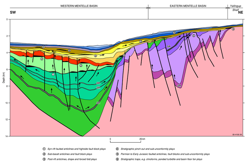 In the eastern Mentelle Basin potential trap types include faulted anticlines, highside fault blocks, and sub-unconformity traps (Play Type 5, Figure 7). Reservoirs are likely to be present throughout the pre-breakup succession and Lower Permian coals should provide mature source rocks. Potential stratigraphic traps (Play Type 6, Figure 7) occur within post-rift strata, both in the eastern and western Mentelle basins. These traps include turbidite sandstones sealed by slope mudstones within prograding shelf-slope wedges and ponded turbidite sandstones encased in slope mudstones.
