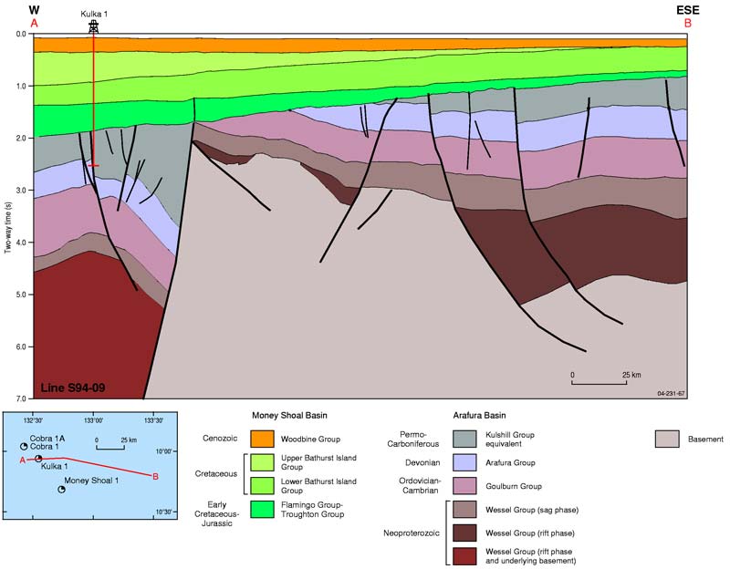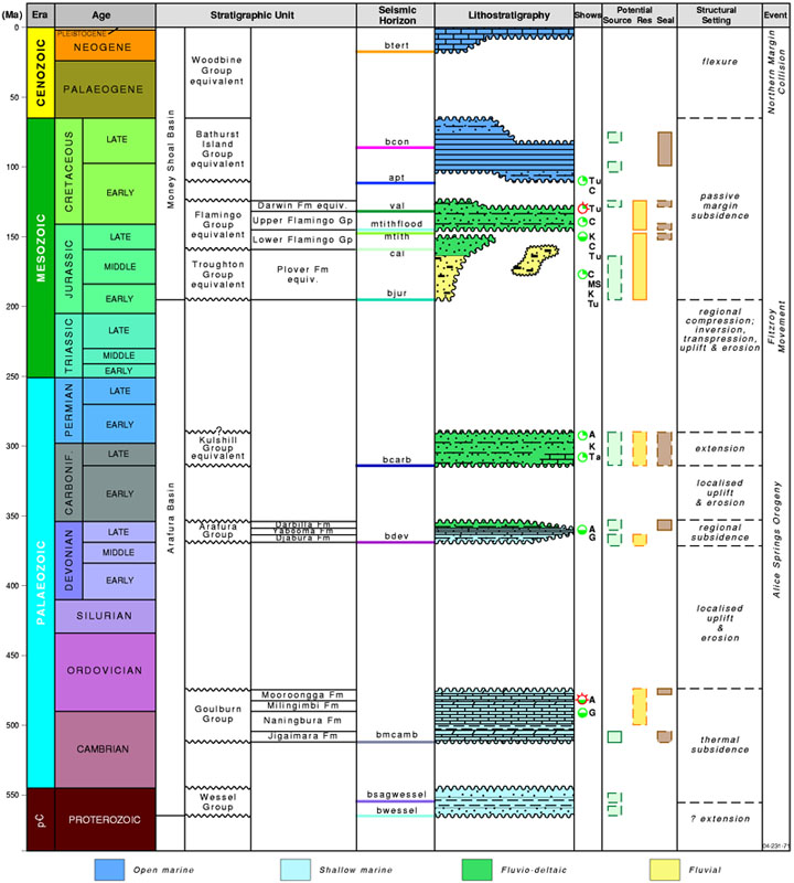 The Arafura Basin formed in the Neoproterozoic as a result of NW-SE upper crustal extension producing a series of NE-SW trending half graben across much of the basin. During this time the dominantly clastic sediments of the Wessel Group were deposited. Subsequent periods of subsidence in the Cambro-Ordovician, Late Devonian and Late Carboniferous to Early Permian were separated by long, tectonically quiescent periods of non-deposition and erosion. The predominantly marine carbonates of the Cambro-Ordovician Goulburn Group are overlain by shallow marine to non-marine clastics and carbonates of the Devonian Arafura Group and fluvio-deltaic clastics of the Late Carboniferous to Early Permian Kulshill Group equivalent.