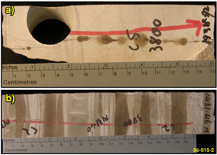 b) banded oil staining within Devonian siltstone