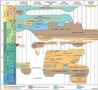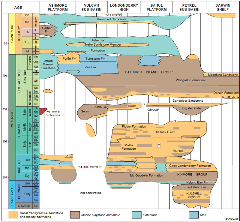 The Jurassic depocentres contain thick marine mudstones flanked by fan delta sandstones. A thick post-rift Cretaceous-Tertiary succession is dominated by fine-grained clastic and carbonate facies. Late Miocene-Pliocene convergence of the Australian and Eurasian plates resulted in flexural downwarp of the Timor Trough and widespread reactivation of the previous extensional fault systems.