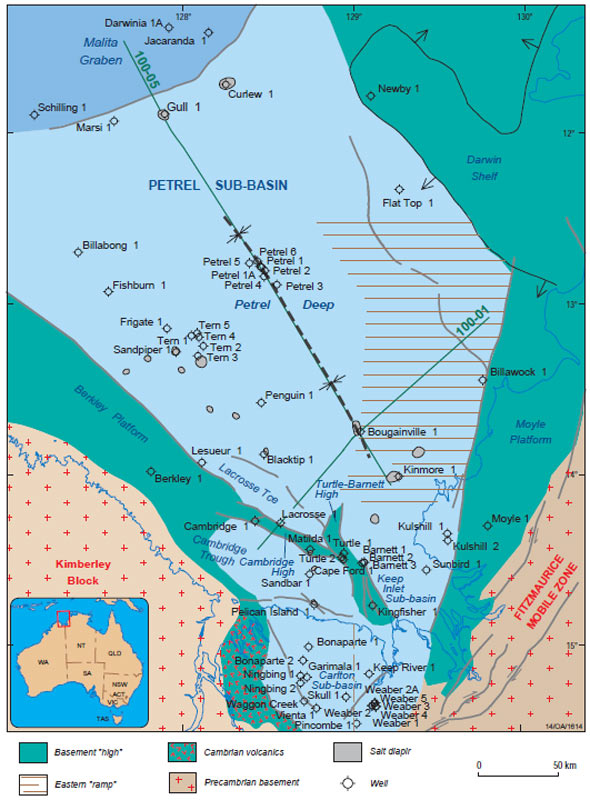 The Petrel Sub-basin is an asymmetric, northwest-southeast trending Palaeozoic rift in the southeast portion of the Bonaparte Basin and contains mostly Palaeozoic and Mesozoic sediments.