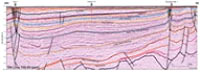 The stratigraphy and structure of the sub-basin is illustrated by the two following regional seismic lines. Stratigraphic units dip regionally to the northwest about a northwest-plunging synclinal axis, resulting in exposure of lower Palaeozoic strata in the southern onshore area and in progressive subcropping of upper Palaeozoic to Tertiary strata offshore beneath Quaternary sediments.