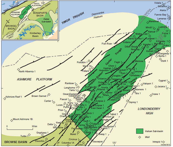 The Vulcan Sub-basin is a northeast-southwest trending Mesozoic extensional depocentre in the western Bonaparte Basin and comprises a complex series of horsts, grabens and terraces. The Vulcan Sub-basin developed as an intra-continental graben in the late Callovian and structuring continued through to the Tithonian.