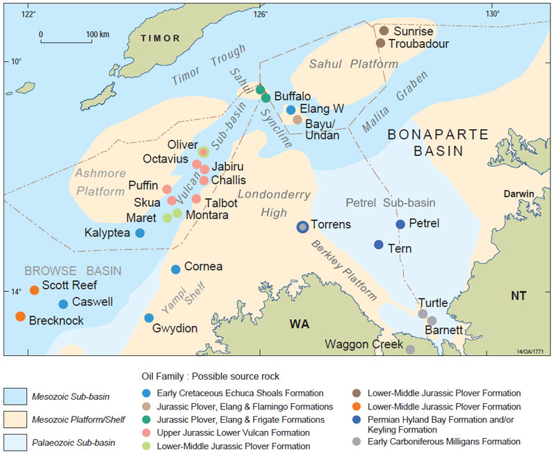 The most prospective part of the Bonaparte Basin includes the Vulcan Sub-basin, Laminaria-Flamingo High and northern Sahul Platform. Oils in the basin are normally very light. The Late Jurassic marine section is the major source interval in the outboard grabens, together with Middle-Lower Jurassic marine shales and coastal plain coals. In the Petrel Sub-basin the main sources are postulated Lower Carboniferous marine shales and Permian coastal plain coals and pro-delta shales. Reservoirs range in age from Carboniferous-Permian in the Petrel Sub-basin and Londonderry High, Triassic to Cretaceous in the Vulcan Sub-basin and Jurassic in the northern parts of the basin. Fault seal breach is one of the main risks in the western part of the basin.