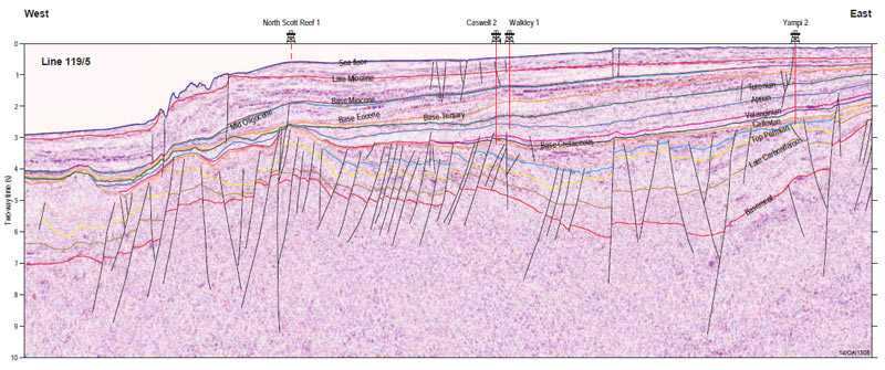 GA seismic line 119/5 across the Caswell Sub-basin (tying North Scott Reef 1, Caswell 2 and Yampi 2) shows the stratal relationships and megasequence packaging of the basin fill. Seismic horizons are colour-coded to sequence boundaries shown on the Tectonostratigraphic Chart.