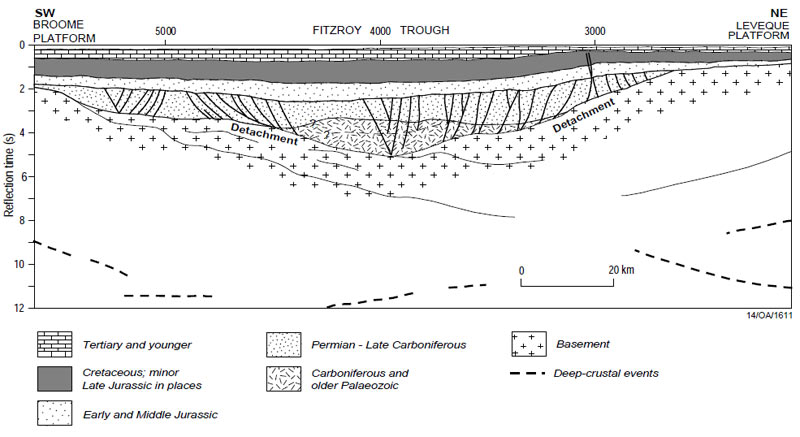 The offshore Fitzroy Trough is a broad depression bounded by southwest- and northeast-dipping faults and overlies early Palaeozoic and Precambrian 'basement'. The location of the cross-section (pink line) can been seen on the Regional structural elements map.