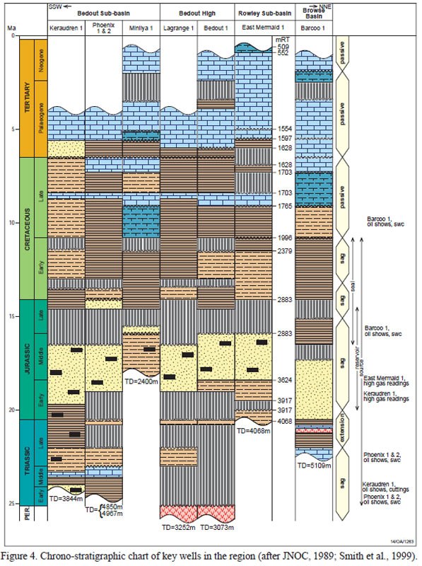 The Rowley Sub-basin, situated on the outer continental margin, comprises a seaward-thickening wedge of Triassic to Recent sediments that are terminated at the continental-oceanic crust boundary by massive down-to-the-northwest faults. The thickest section in the sub-basin comprises six kilometres (4 seconds TWT) of Mesozoic to Recent sediments underlain by nine kilometres (5 seconds TWT) of Palaeozoic sediments.