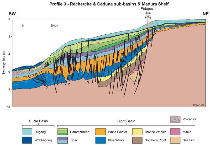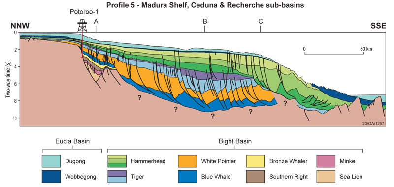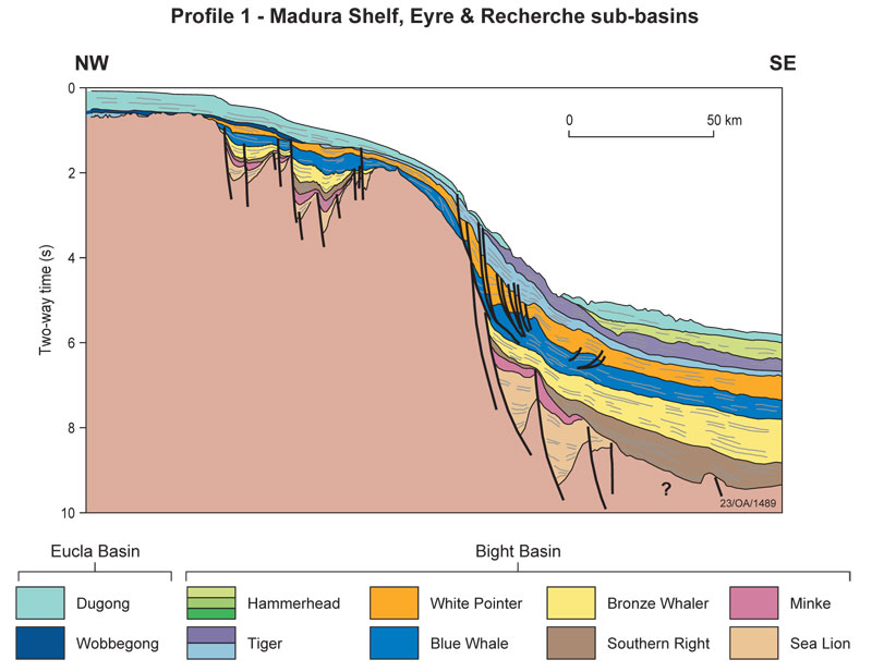 Madura Shelf, Ceduna and Recherche Sub-basins cross-section © Geoscience Australia.
