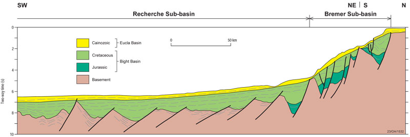 The Bight Basin is overlain unconformably by the dominantly cool-water carbonates of the Cainozoic Eucla Basin. To the south, the uppermost sequences of the Bight Basin onlap highly extended continental crust and rocks of the continent-ocean transition on the abyssal plain between Australia and Antarctica.