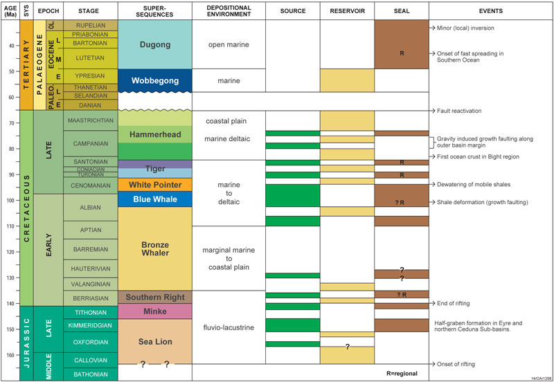 A sequence stratigraphic scheme for the Bight Basin has been developed by Geoscience Australia based on the identification of four megasequences, each related to a different basin phase and their component 2nd-order supersequences.