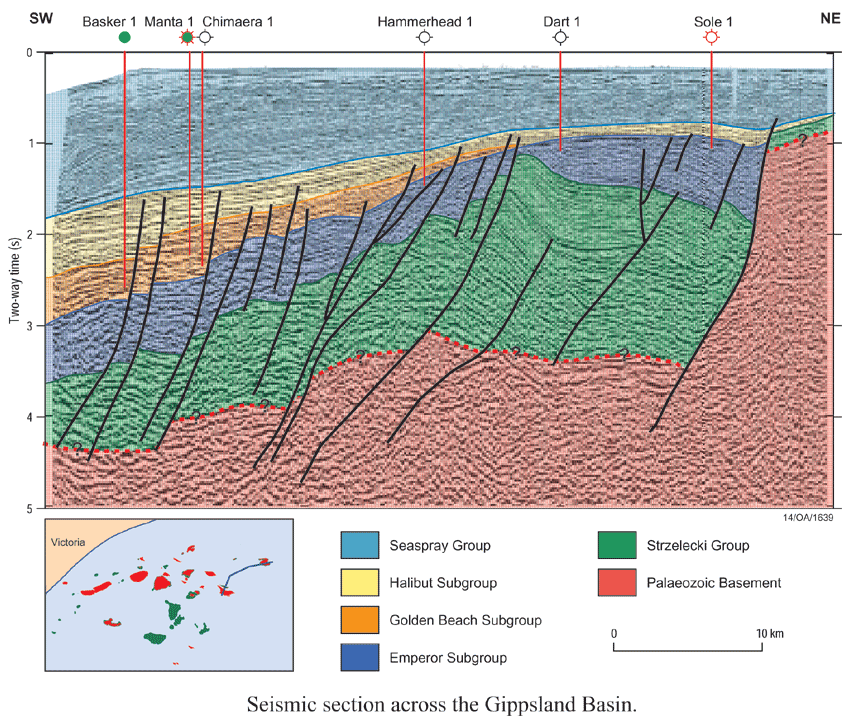 The Gippsland Basin contains in excess of 10km of Cretaceous to Neogene sediments. The succession is non-marine clastics, to marginal marine clastics, marine clastics and uppermost marine carbonates.
