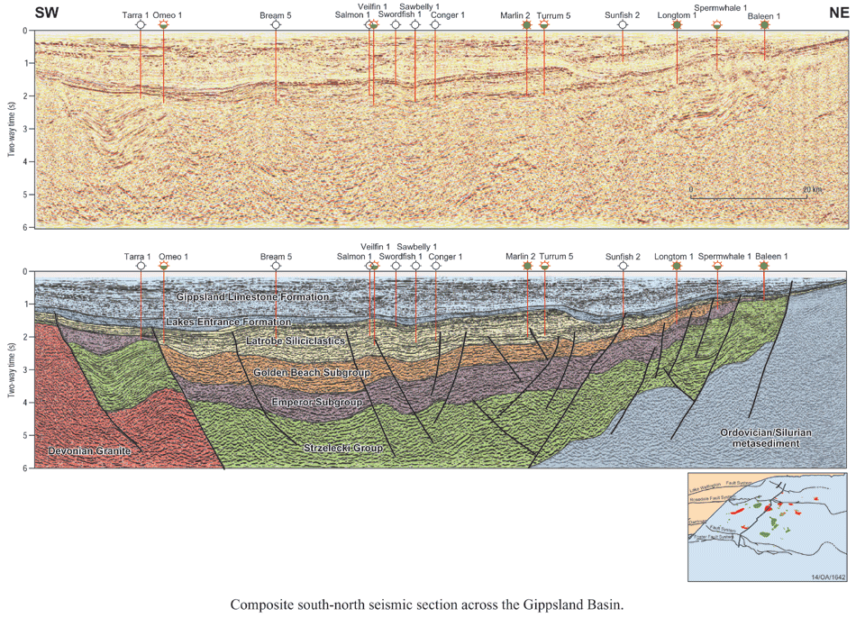 Two regional cross-sections have been selected to provide examples of the regional geometry, distribution, thickness and structural framework of the Gippsland Basin.