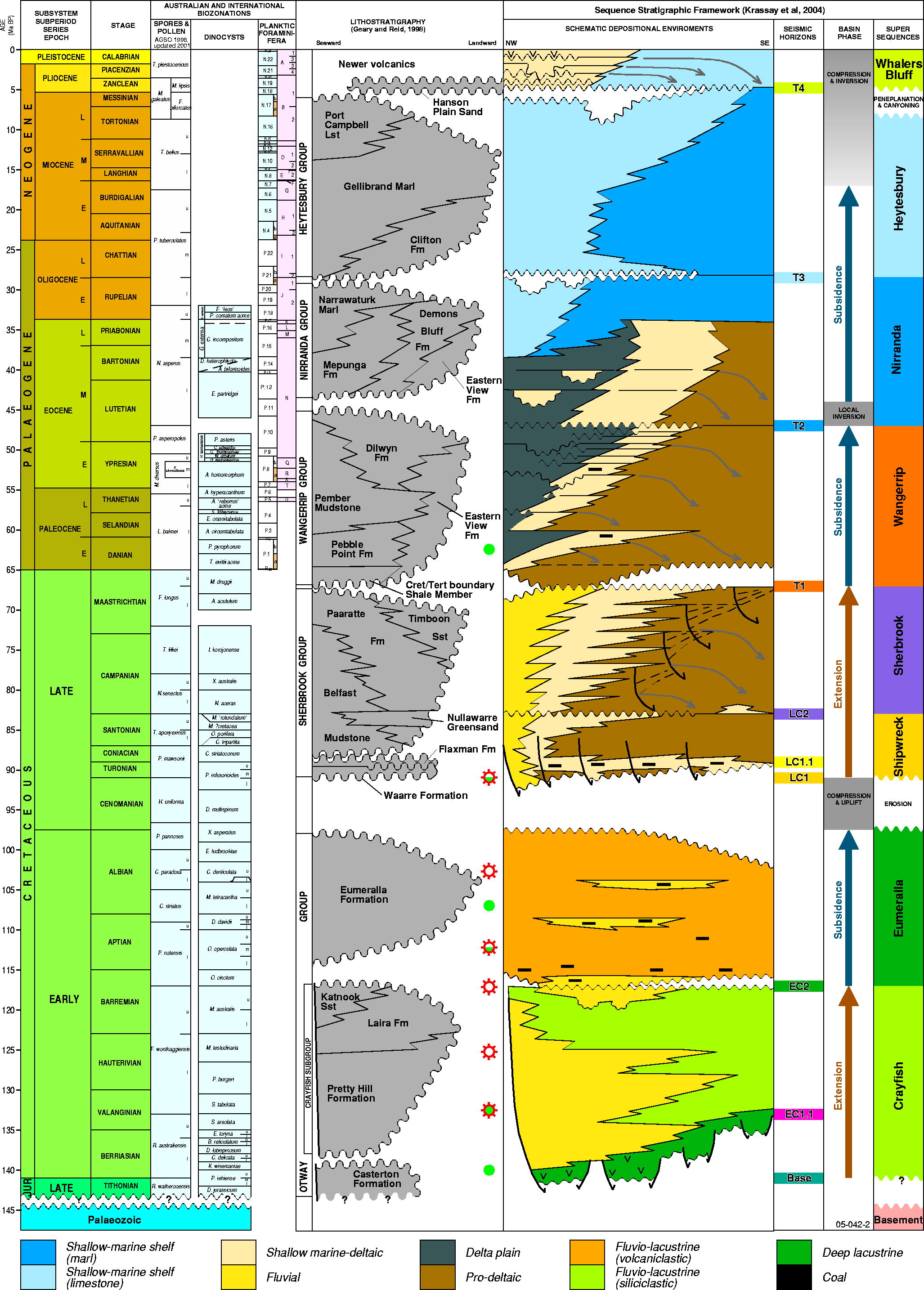 - latest Maastrichtian to Middle Eocene basin reorganisation and early thermal subsidence of the Wangerrip Supersequence (coastal plain, deltaic and shallow marine deposition),