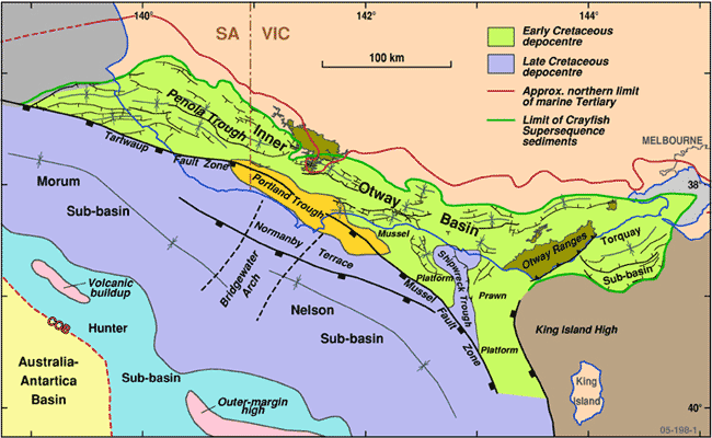 The basin contains five major depocentres, the mainly onshore Inner Otway Basin, the offshore Morum, Nelson and Hunter Sub-basins and eastern Torquay Sub-basin. The Latest Jurassic-Early Cretaceous Otway Supergroup comprises up to 8km of continental and fluvio-lacustrine sediments that accumulated in grabens and half-grabens of the first rifting event. Coastal-plain, deltaic and marine sediments of the Late Cretaceous Sherbrook Group are up to 5km thick. The Paleocene-middle Eocene Wangerrip Group sediments were deposited in coastal plain, deltaic and inner shelf settings and are separated from the open marine, mixed carbonates/siliciclastics of the Eocene-Miocene Nirrandra and Heytesbury groups, by a major unconformity.
