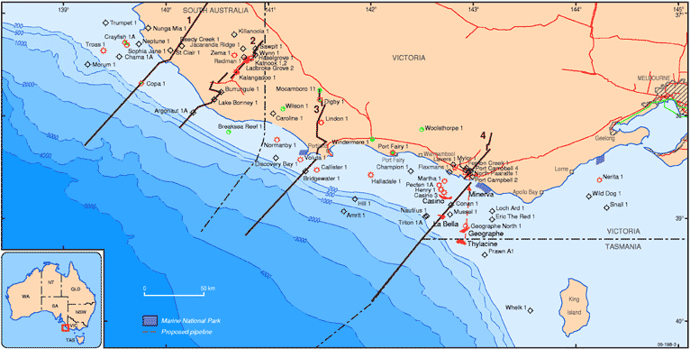 | Offshore | La Bella 1 (217 BCF GIP), Minerva 1 (558 BCF GIP) in 1993, Geographe 1 (500 BCF GIP) and Thylacine 1 (600 BCF) in 2001. Casino 3, successful production test (2003). First gas production from the Minerva field occurred in January 2005 with the Casino and Thylacine/Geographe gas fields due to begin production in 2006. |