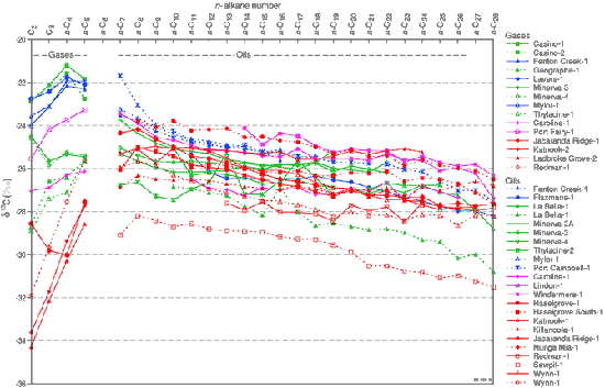 Plot of carbon isotopic composition of individual Otway Basin hydrocarbons