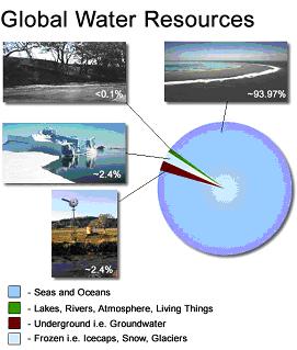 Approximately 2 per cent of the Earth's water occurs as groundwater, compared with 0.1 per cent as rivers and lakes and 94 per cent as oceans.