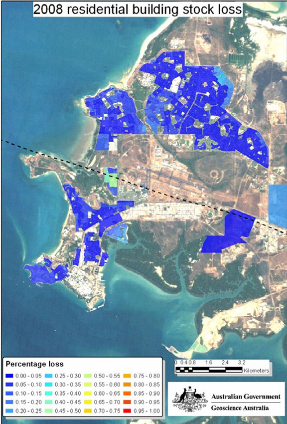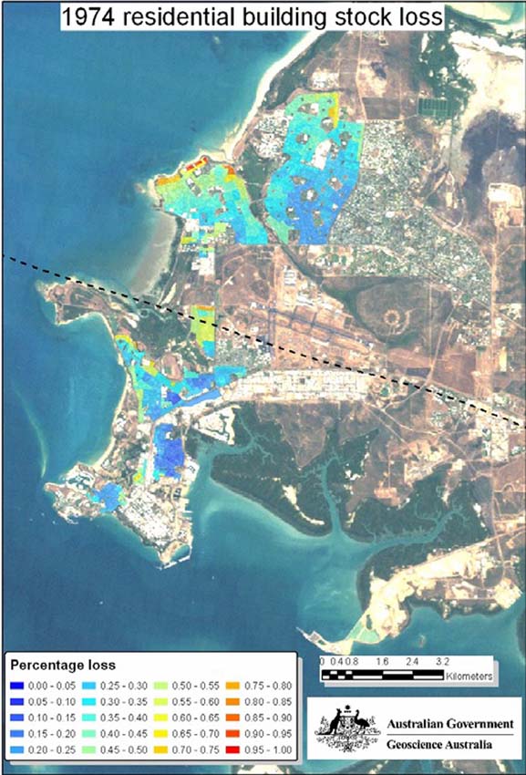 For the 2008 analysis, Geoscience Australia estimated the damage to Darwin residential structures at 3.5 per cent of full reconstruction costs. This reflects a 90 per cent reduction in mean losses compared to the 1974 impact. In contrast to the 1974 simulation, the improved building standards mean a vast reduction in the number of buildings that would suffer complete destruction.