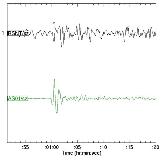 | Nuke or earthquake? Novaya Zemlya nuclear explosion recorded on RSNT seismograph station in USA and a deep Fiji earthquake recorded on ASAR seismic station in Australia. © Geoscience Australia |