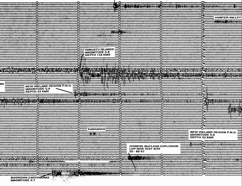 Canberra seismograph recording of 16th August 1995. Note that the significant Lop Nor explosion is swamped by other seismic events on that day. © Geoscience Australia |