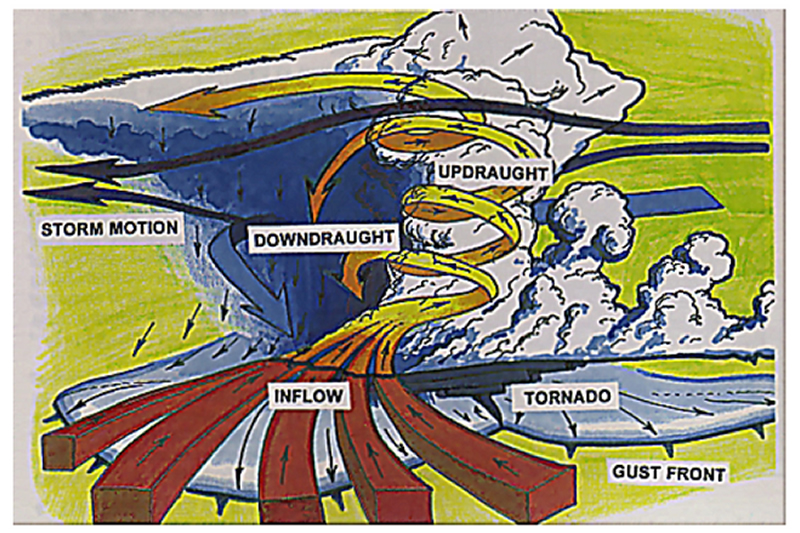 The most intense of all atmospheric circulations on a local scale, tornadoes are the rarest and most violent of thunderstorm phenomena. A tornado is a violently rotating column of air suspended from large thunderstorm clouds in contact with the ground. It has a funnel shape and its vortex can range in width from a few metres to hundreds of metres. The majority of strong and violent tornadoes occur in association with super cell thunderstorms. These often occur at the connecting zone between updraught and downdraught regions of a thunderstorm. Weaker tornadoes may spawn from either multi cell or single cell thunderstorms.