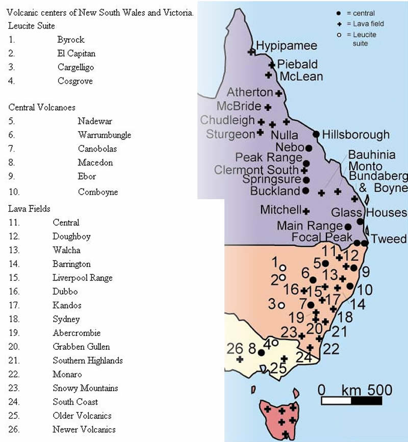 Evidence for volcanism throughout geological time can be found in every Australia State and Territory, with extensive volcanism down the east coast during the past 60 million years. This volcanic activity can be divided into areas where large amounts of lava flowed from diffuse dykes and pipes over a wide area and others where volcanism was produced from either a single central vent or a cluster of vents.