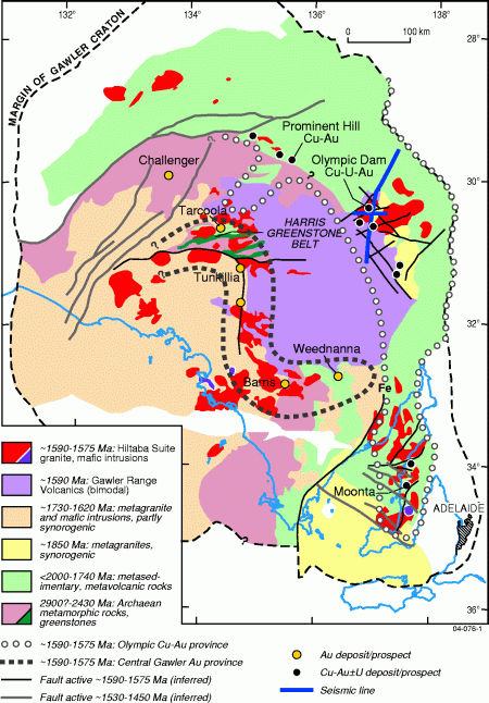 Most work in the project focussed on Module A, covering iron oxide Cu-Au (IOCG) systems in the Olympic Cu-Au province and Au systems in the Central Gawler Au province (Fig. 1). Modules B, C and D were completed earlier in the project and results may be obtained from the Gawler Mineral Promotion Project Publications and from Gawler Craton Mineral Promotion: Maps and Data. For example, in Module C, products include a map in PDF format, and a paper on Late Archean Lake Harris Komatiite Central Gawler Craton, South Australia: Geological Setting and Geochemistry (Hoatson et al., 2005). Major products from Module D include datasets from Airborne Electromagnetic (AEM) surveys for the areas of the Challenger Au deposit, the Tunkillia Au prospect and the Moonta-Wallaroo Cu-Au district, as well as a Interpretation of airborne electromagnetic data: summary report on the Challenger Workshop (Lane and Worrall, 2002).